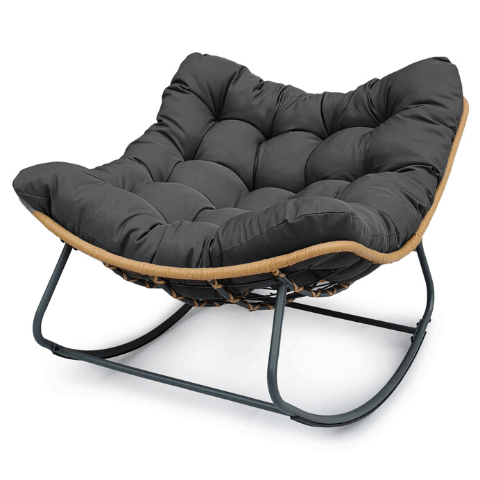 Zahradní houpací křeslo v šedé barvě kombinuje pevnou kovovou konstrukci s pohodlným silným polstrováním potaženým kvalitní šedou látkou. Design křesla umožňuje příjemné houpání díky stabilnímu rámu, který zároveň zajišťuje lehkost a snadnou manipulaci. Polstrování je dostatečně silné a měkké, což přispívá k dlouhodobému komfortu při relaxaci na balkóně či terase. Celkový tvar křesla podporuje ergonomické sezení a odpočinek. Díky použitým materiálům je křeslo vhodné pro venkovní použití s důrazem na odolnost a snadnou údržbu.