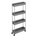 Pojízdný úložný vozík s čtyřmi policemi nabízí praktické řešení pro organizaci drobných předmětů v domácnosti či kanceláři. Police jsou vyrobeny z bílého plastu, který se snadno udržuje, a jsou propojeny kovovými tyčemi zajišťujícími stabilitu celého vozíku. Vozík je vybaven plastovými kolečky, která umožňují snadnou manipulaci a přesun v prostoru. Kompaktní rozměry a otevřená konstrukce polic usnadňují přístup k uloženým věcem a zároveň šetří místo.