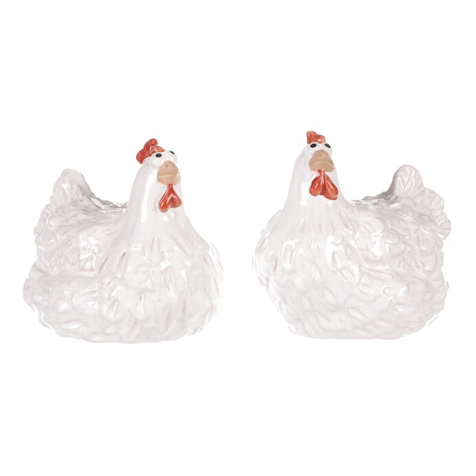 Keramická dekorace ve tvaru slepice a kohouta v bílém provedení přináší do interiéru jemný rustikální nádech. Detailně propracované tělo s lesklou glazurou zdůrazňuje texturu peří a výrazné červené detaily na hřebenu a laloku dodávají dekoraci živost. Vhodná pro umístění na poličku, komodu nebo jako součást tematické dekorace. Díky pevnému keramickému materiálu se snadno udržuje a zachovává svůj vzhled po dlouhou dobu.