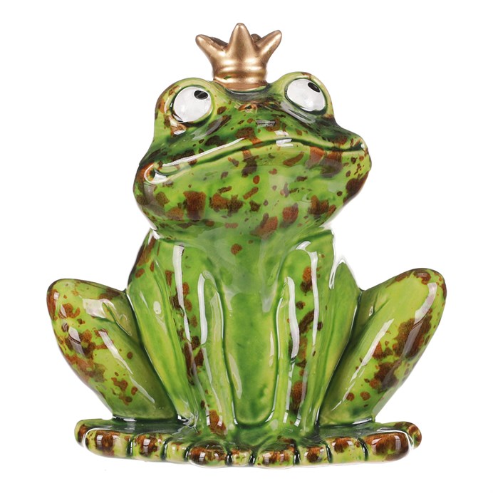 Keramická figurka žáby s korunkou na hlavě bude úžasným oživením vaší zahrady, terasy, pergoly nebo jiného vhodného prostoru. Její syté zelené zbarvení dodá zejména zahradě příjemný dekorativní prvek, který dokonale splyne s přírodním prostředím. Žába svým milým provedením upoutá pozornost a přinese do prostoru příjemné oživení. Ať už ji postavíte mezi květiny, na trávník, vedle jezírka nebo na viditelné místo terasy, bude vždy vypadat skvěle. Právě její velké vykulené oči a hravý výraz bude inspirací pro vás i všechny návštěvníky pro vytvoření místa se skutečně příjemnou atmosférou.