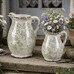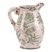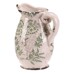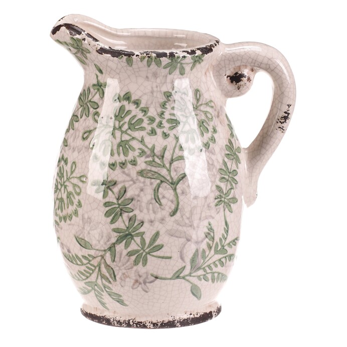 Keramický retro džbánek střední velikosti je krásný dekorativní doplněk s krémovým povrchem a jemným zeleným květinovým dekorem. Patina spolu s krakelovanou glazurou mu dodává půvabný vintage vzhled, který se hodí do rustikálně laděných interiérů i na zahradní stolky. Díky širokému hrdlu a praktickému uchu se skvěle využije jako obal na květiny nebo stylová dekorace. Kvalitní keramika a snadná údržba zajistí, že vám bude zdobit domov dlouhá léta.