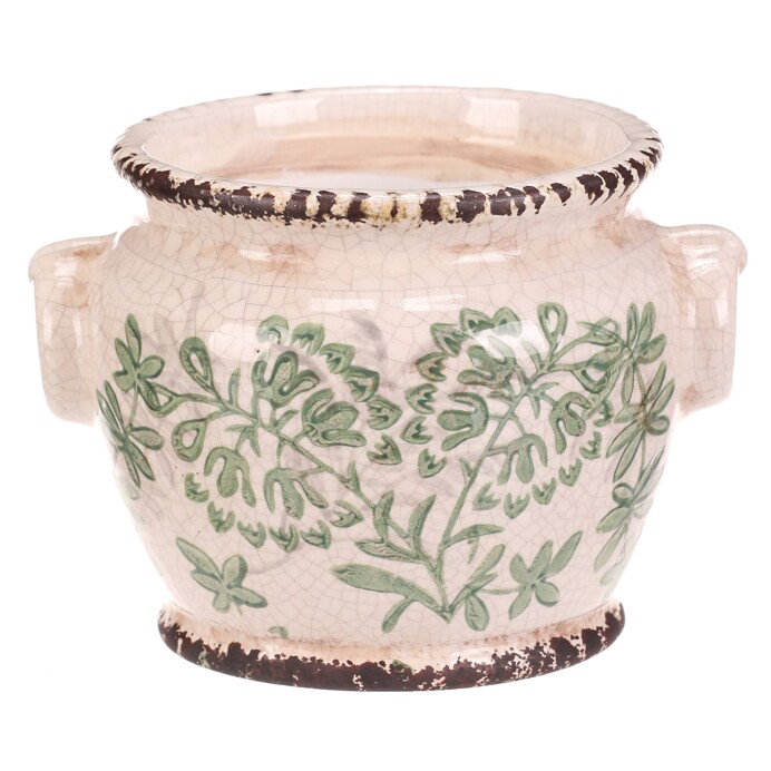Keramický obal ve tvaru retro hrnce v krémovém odstínu zdobí jemný zelený dekor listů, který podtrhuje jeho vintage charakter. Povrch s jemnou prasklinovou glazurou dodává výrobku autentický vzhled a příjemnou texturu. Díky svému kompaktnímu provedení ve velikosti S je vhodný pro menší rostliny nebo jako dekorativní doplněk interiéru. Hrnec má dvě malé uši po stranách, které zvyšují jeho estetickou hodnotu a usnadňují manipulaci. Je ideální pro vytvoření přírodního a útulného prostředí v domácnosti či kanceláři.