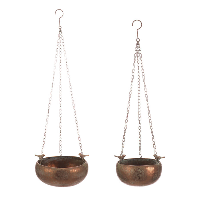 Sada dvou závěsných kovových obalů v měděném odstínu je vhodná pro dekorativní využití v interiéru i exteriéru. Každý obal je zavěšen na třech tenkých řetízcích, které jsou spojeny praktickým háčkem pro snadné zavěšení. Jemné detaily ve formě malých ptáčků na okraji dodávají výrobku originální vzhled a vizuální efekt. Měděný povrch s patinou přispívá k rustikálnímu charakteru a snadné údržbě. Obaly jsou ideální pro květiny nebo jiné dekorace, které vyniknou díky jejich provedení a zavěšení.