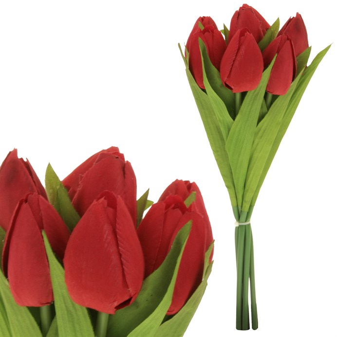 Tato kytice umělých červeně zbarvených tulipánů obsahuje sedm krásných květů, které jsou ideální pro jarní aranžování. Díky nim můžete vytvořit vlastní barevné zátiší přímo doma či jiných vhodných prostorech. Umělé tulipány nejenom skvěle vyzdobí vybrané místo, ale také mu dodají svěžest a barevnost, kterou si spojujeme právě s příchodem jara. Jsou to nádherné a oblíbené jarní květiny, ale jako řezané bohužel nevydrží příliš dlouho, protože jejich okvětní lístky rychle opadávají. S těmito umělými však tento problém nenastane, a tak si jich v plné kráse můžete užívat natrvalo.