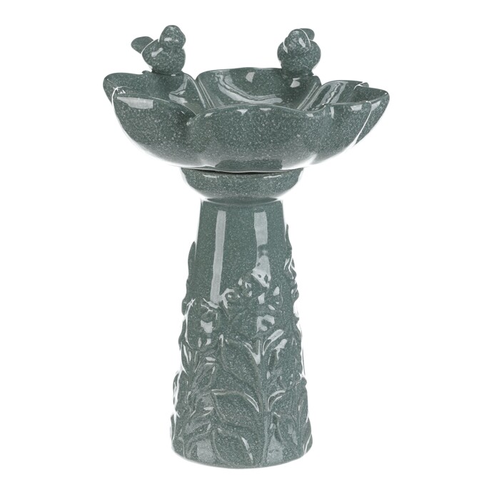 Keramické krmítko a pítko ve tvaru květu s dvěma ptáčky v tmavě mentolovém odstínu přináší do zahrady nebo na terasu dekorativní i praktický prvek. Povrch je hladký a lesklý, což usnadňuje údržbu a zajišťuje dlouhou životnost. Stojaté provedení s výraznou základnou zdobenou reliéfními motivy listů poskytuje stabilitu a vizuální zajímavost. Krmítko je vhodné jako zdroj vody nebo potravy pro ptactvo, které ocení snadný přístup díky otevřenému tvaru květu. Je ideální pro umístění na zahradní stůl, balkón nebo do volné přírody.