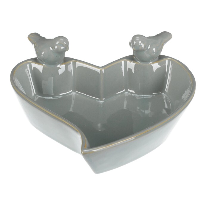 Keramické krmítko a pítko ve tvaru srdce v mentolovém odstínu nabízí praktické a dekorativní řešení pro venkovní prostory. Jeho hladké glazurované provedení usnadňuje údržbu a zajišťuje odolnost vůči povětrnostním vlivům. Na okraji jsou umístěny dvě drobné keramické figurky ptáčků, které dodávají výrobku jemný dekorativní detail. Kompaktní velikost S umožňuje snadné umístění na zahradní parapet, balkon nebo do krmítkové stanice. Vhodné jako zdroj vody a potravy pro drobné ptactvo během celého roku.