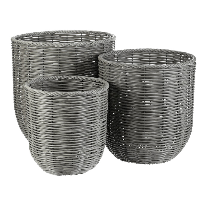 Sada tří obalů na květináče je vyrobena z umělého ratanu v šedém odstínu, který věrně napodobuje přírodní materiál a zároveň je odolný vůči povětrnostním vlivům. Každý obal má pevnou kovovou konstrukci, která zajišťuje stabilitu a dlouhou životnost. Kulatý tvar a husté proplétání polyratanu vytváří příjemný vizuální efekt vhodný do moderních i klasických interiérů. Obaly jsou vhodné pro různé velikosti květináčů a lze je využít jak v interiéru, tak na terase či balkóně. Díky sadě tří kusů je možné vytvořit stylovou a jednotnou dekoraci s praktickým využitím.
