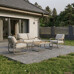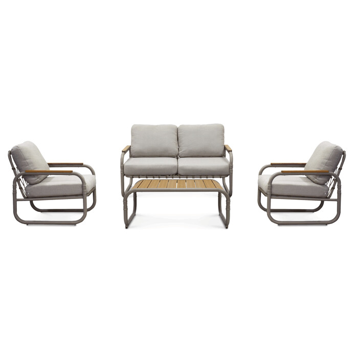 Zahradní set 1+3 v krémovém provedení kombinuje pevnou kovovou konstrukci s pohodlnými polstrováními v béžové látce, která je navržena pro odolnost vůči vnějším vlivům. Set obsahuje jednosedák a trojsedák s opěrkami a područky, které jsou doplněny o praktický stolek s deskou v přírodním odstínu. Kovová podnož je opatřena práškovým lakem, který zvyšuje odolnost proti korozi a zajišťuje stabilitu celé sestavy. Polštáře jsou dostatečně silné a poskytují komfortní posezení, zatímco design s otevřenou zadní částí sedadel dodává lehkost a vzdušnost. Tento zahradní set je vhodný pro relaxaci i společenské posezení na terase či zahradě.