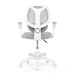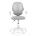Dětská kancelářská židle v šedé síťovině nabízí pohodlné a zdravé sezení díky ergonomicky tvarovanému opěradlu s nastavitelnou bederní opěrkou, která podporuje správné držení těla. Sedák je vyplněn měkkou pěnou a potažen prodyšným materiálem, který zajišťuje cirkulaci vzduchu během delšího používání. Odklápěcí područky umožňují snadné přizpůsobení prostoru a lepší manipulaci s židlí. Plastový kříž v bílé barvě je vybaven kolečky vhodnými pro hladké povrchy a zajišťuje stabilitu i mobilitu. Výškově nastavitelný mechanismus umožňuje individuální přizpůsobení výšky sedáku podle potřeby dítěte.